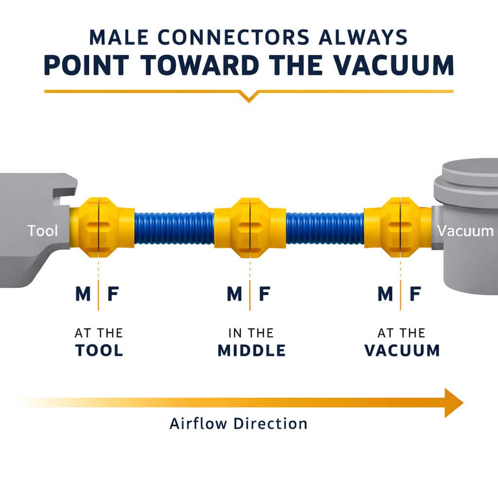 Dust and air always move toward the vacuum, so the male end of each connection faces that direction.