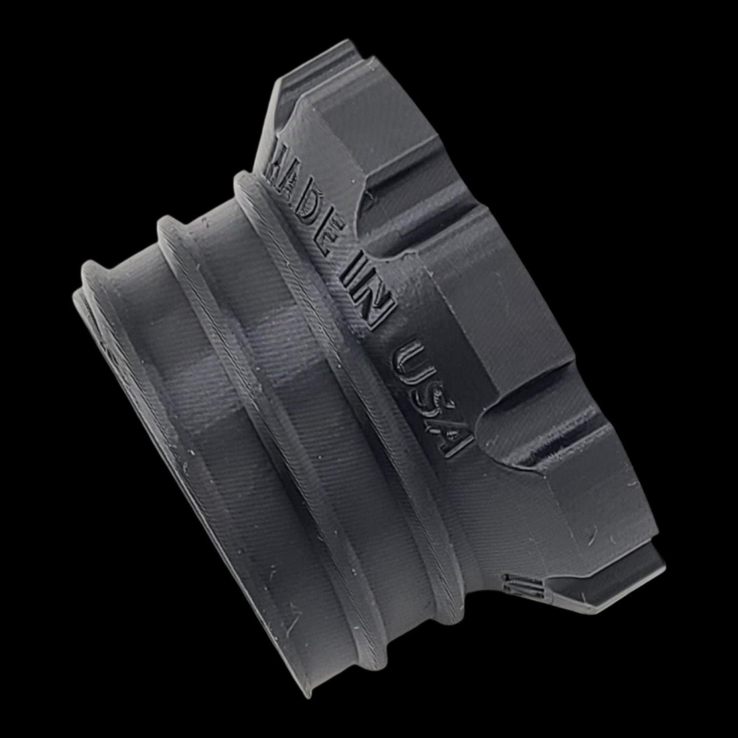 This 2.5″ flex hose adapter will allow you to connect your hose to another hose or a tool port quickly and easily without fiddling with hard-to-press buttons, tabs, or clamps. This is the FEMALE end — in our system, the male end points toward the vacuum source, and the female end points toward the tool.