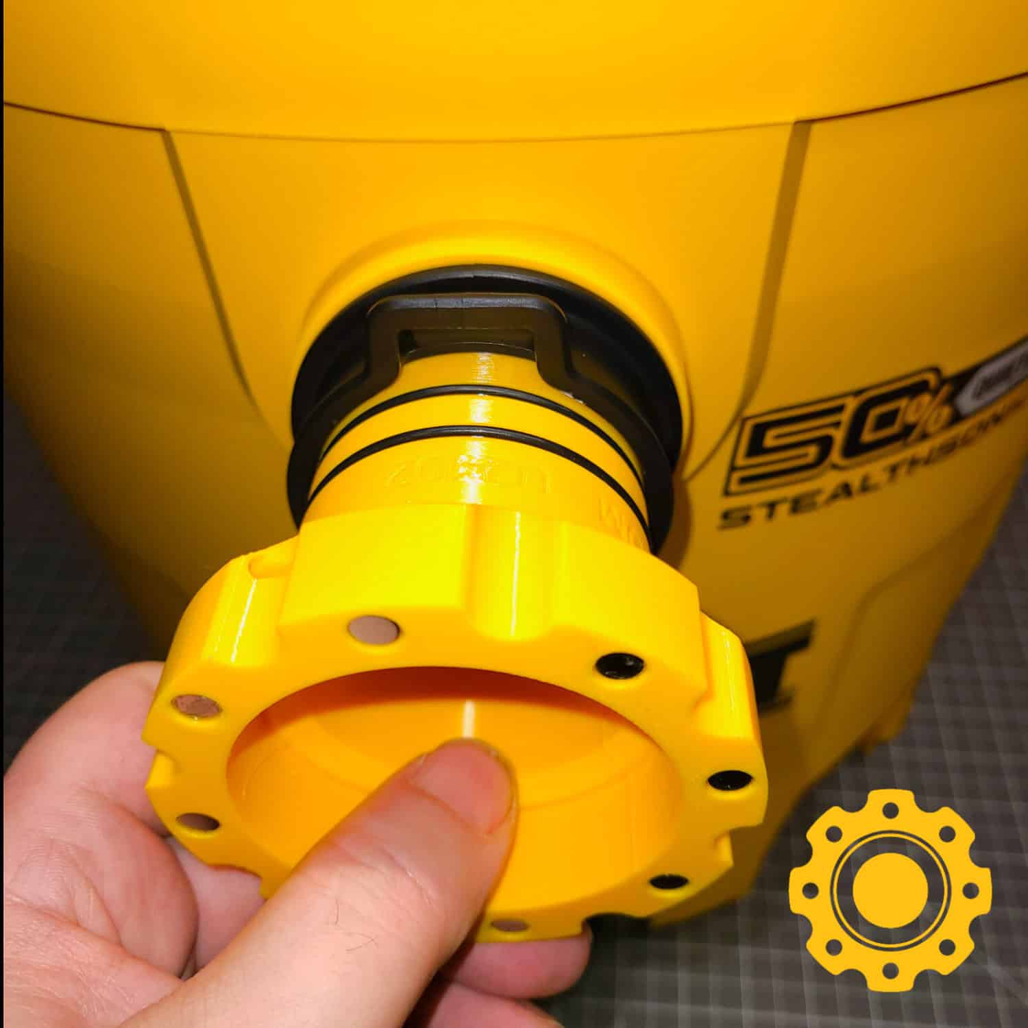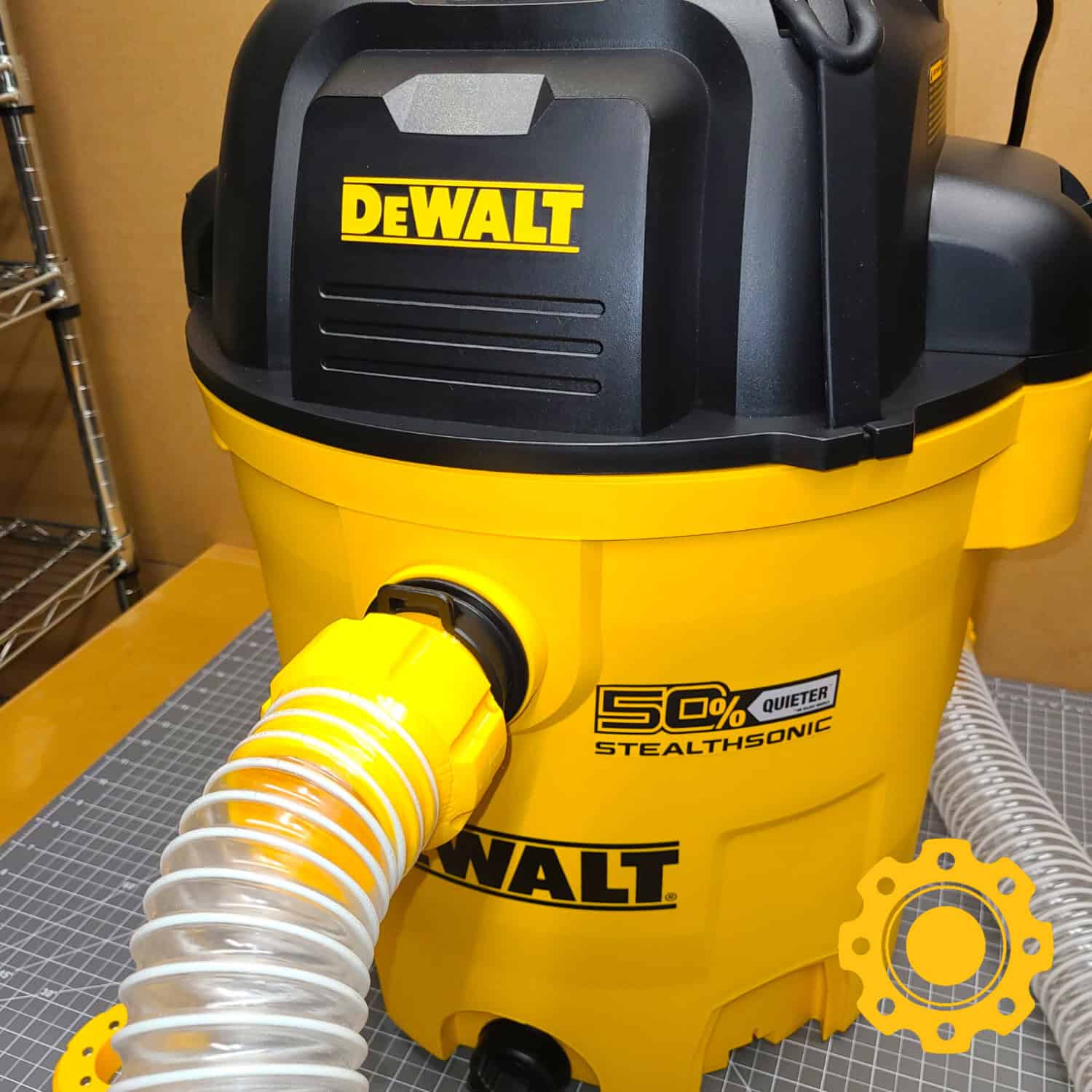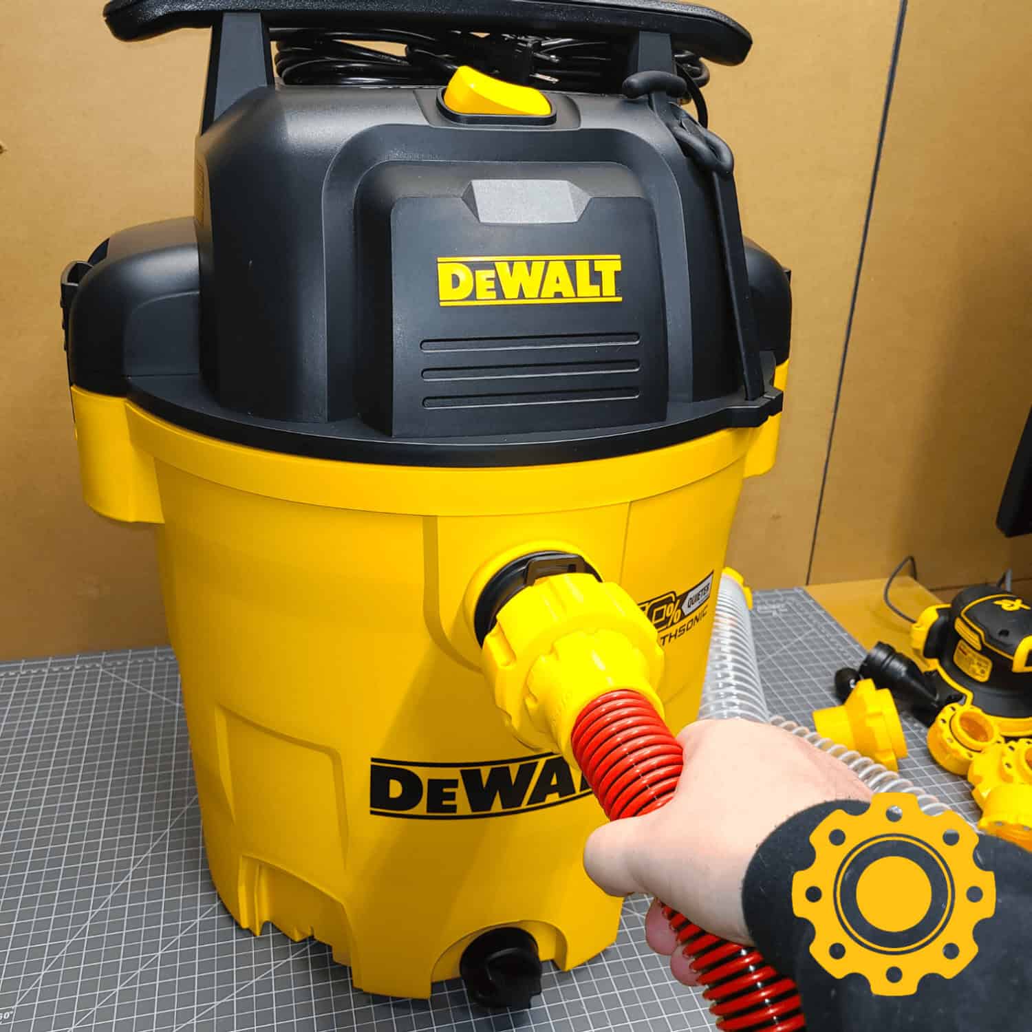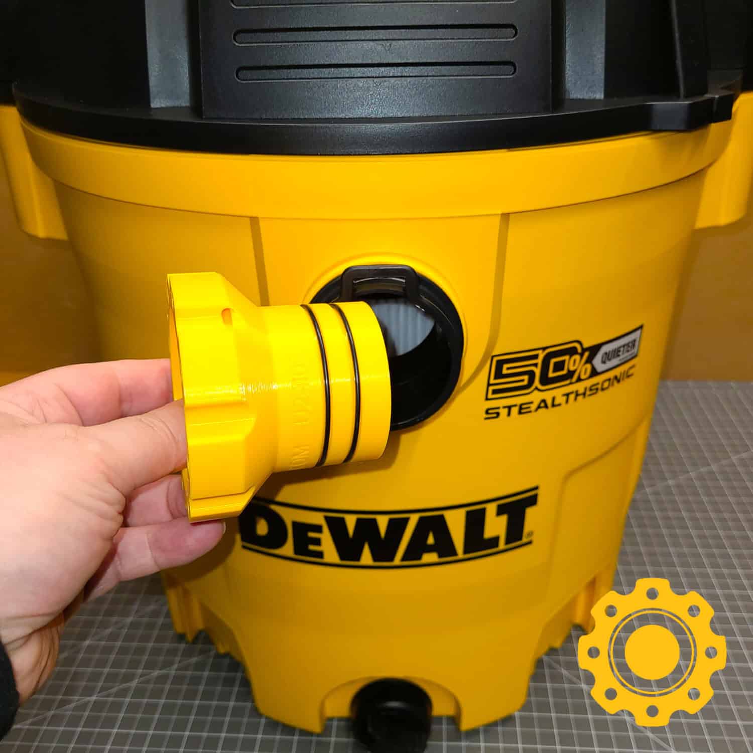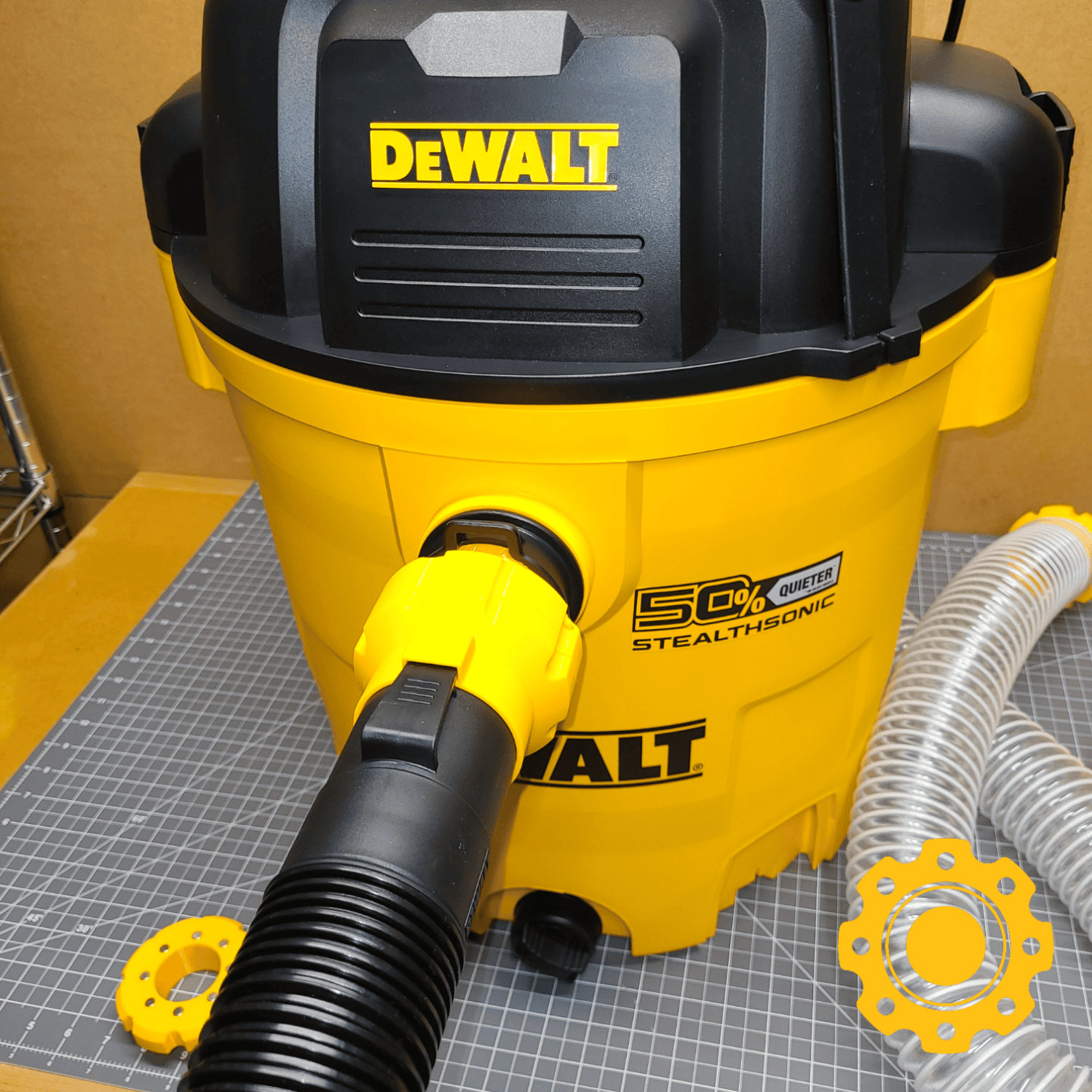 This vacuum port adapter will make your DeWalt shop vac compatible with the HoseJoy system, allowing you to connect any hose to it quickly and effortlessly.