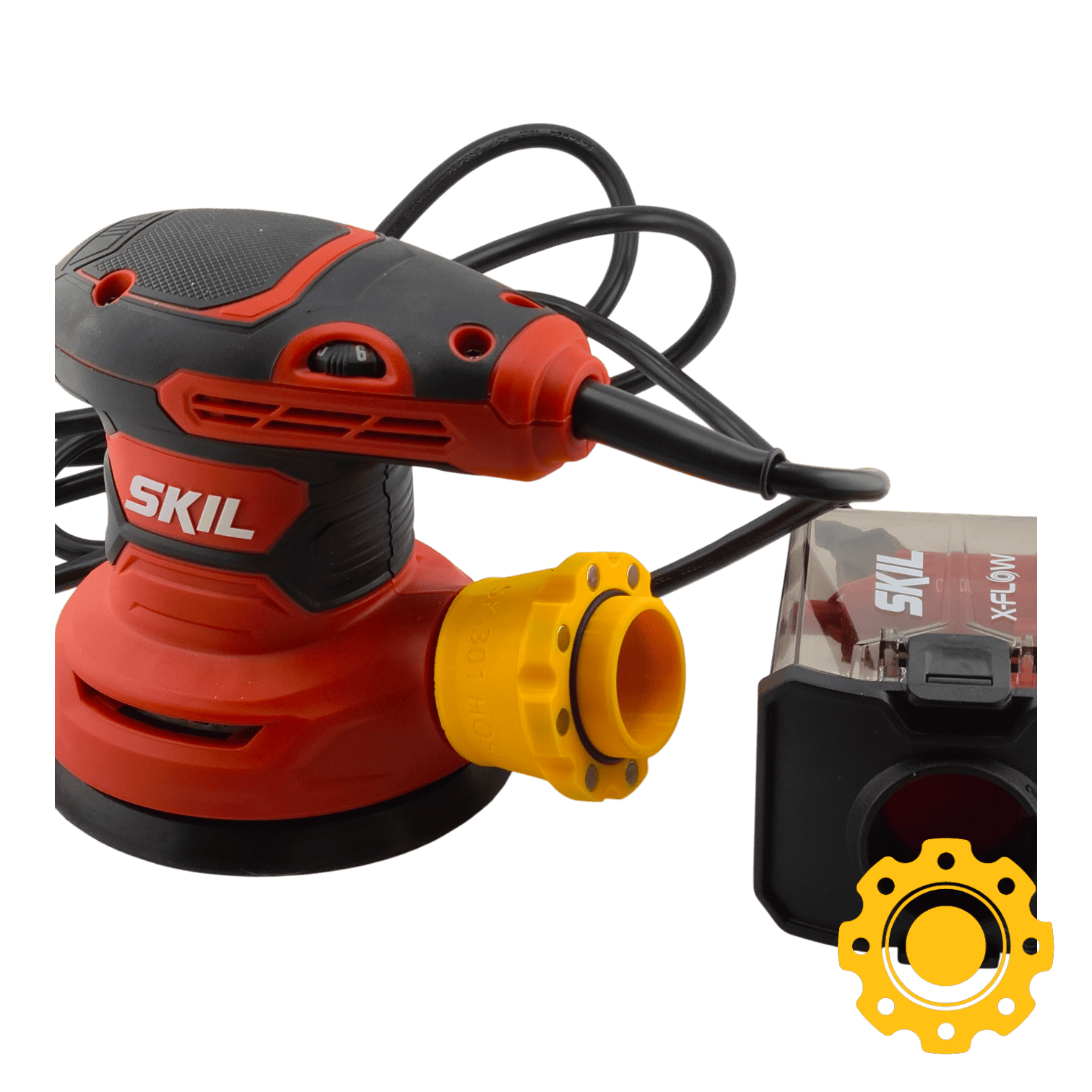 • This specific adapter works on any Skil tool with the X-Flow tool port like the 7492 5-Inch Random Orbit Sander, 7492-02 5-Inch Random Orbit Sander, 7292 1/4-Sheet Palm Sander, 7292-02 1/4-Sheet Palm Sander, etc. and it works by pressing and then rotating, locking the adapter in place and sealing it against the flange on the tool port.
