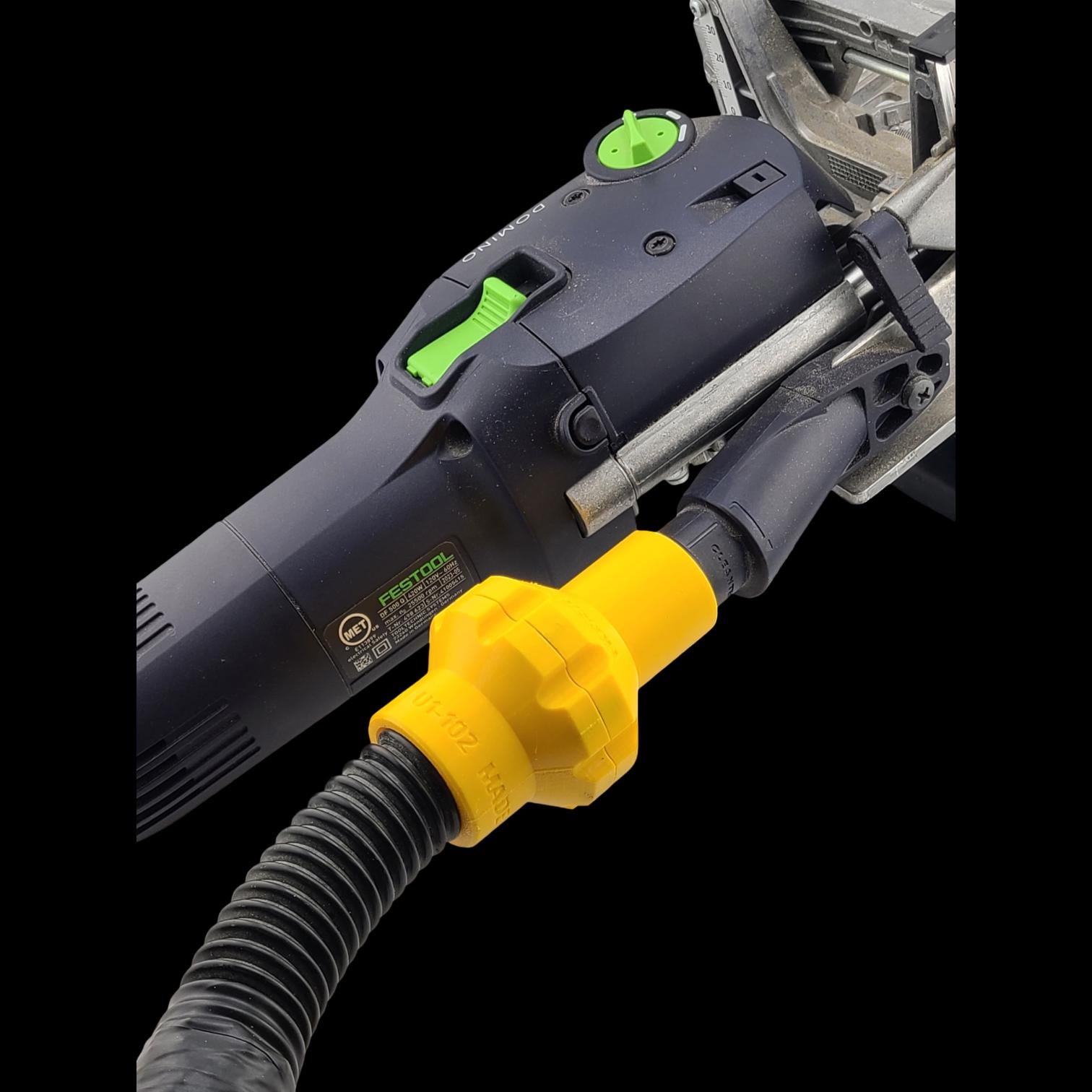 • This specific adapter works on any Festool tool with the 27mm bayonet, and it works by pressing and then rotating, locking the adapter in place and sealing it against the flange on the tool port